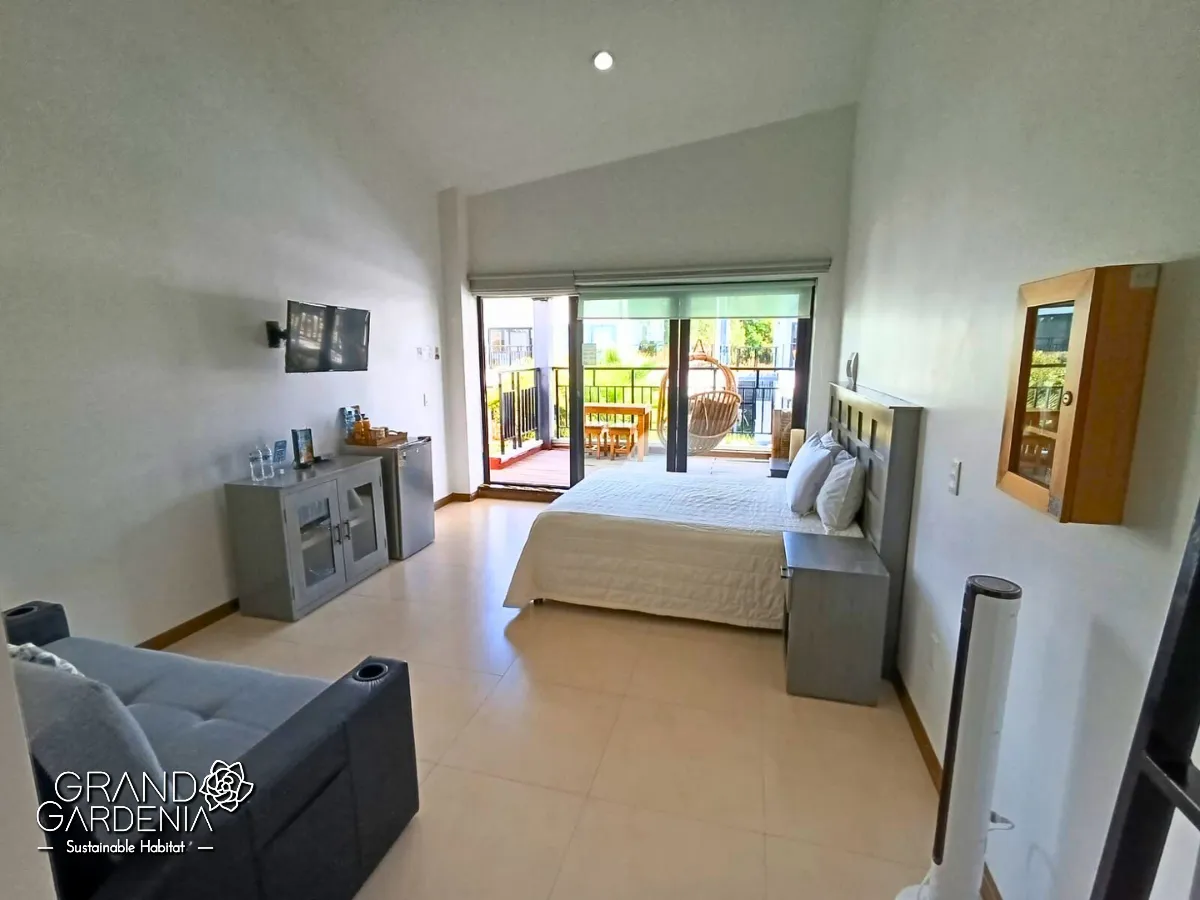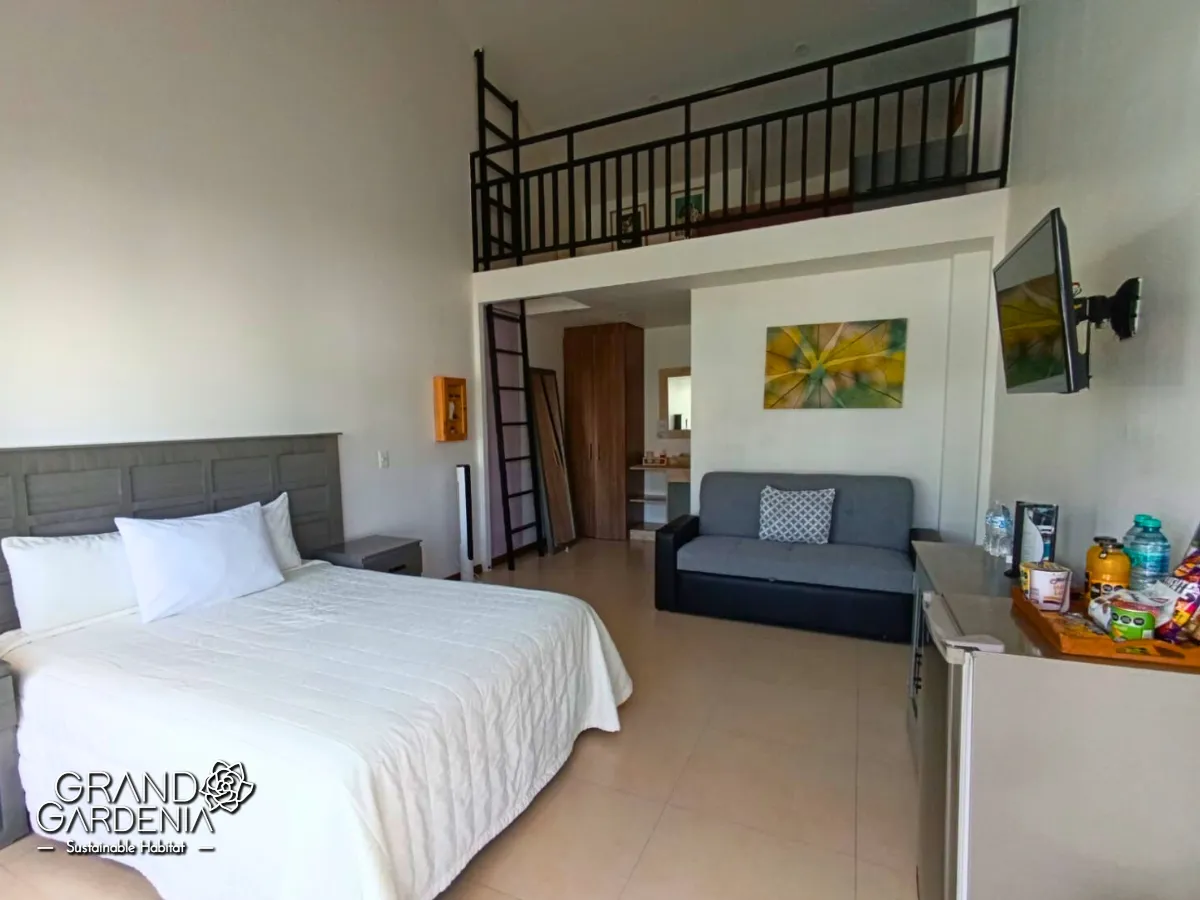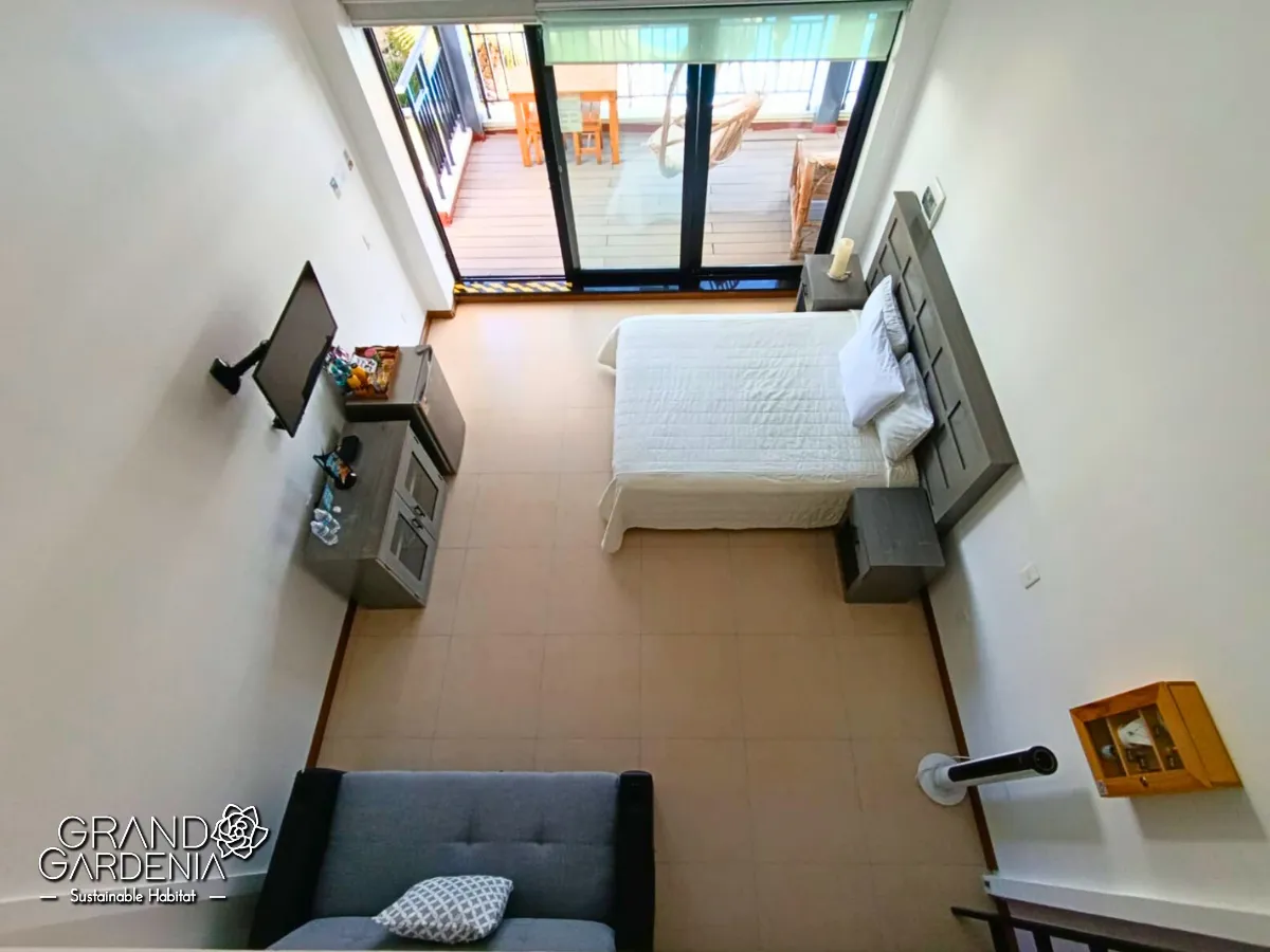 Su tamaño de 65 m' ofrece suficiente espacio para relajarse. Con una pequeña terraza compartida y mezzanine en parte superior. Perfecta para disfrutar de un espacio privado y funcional.