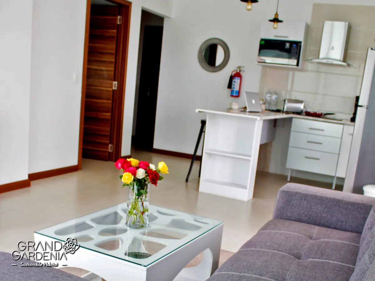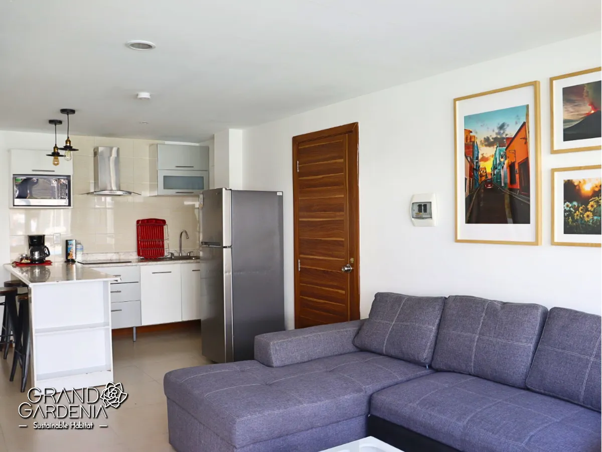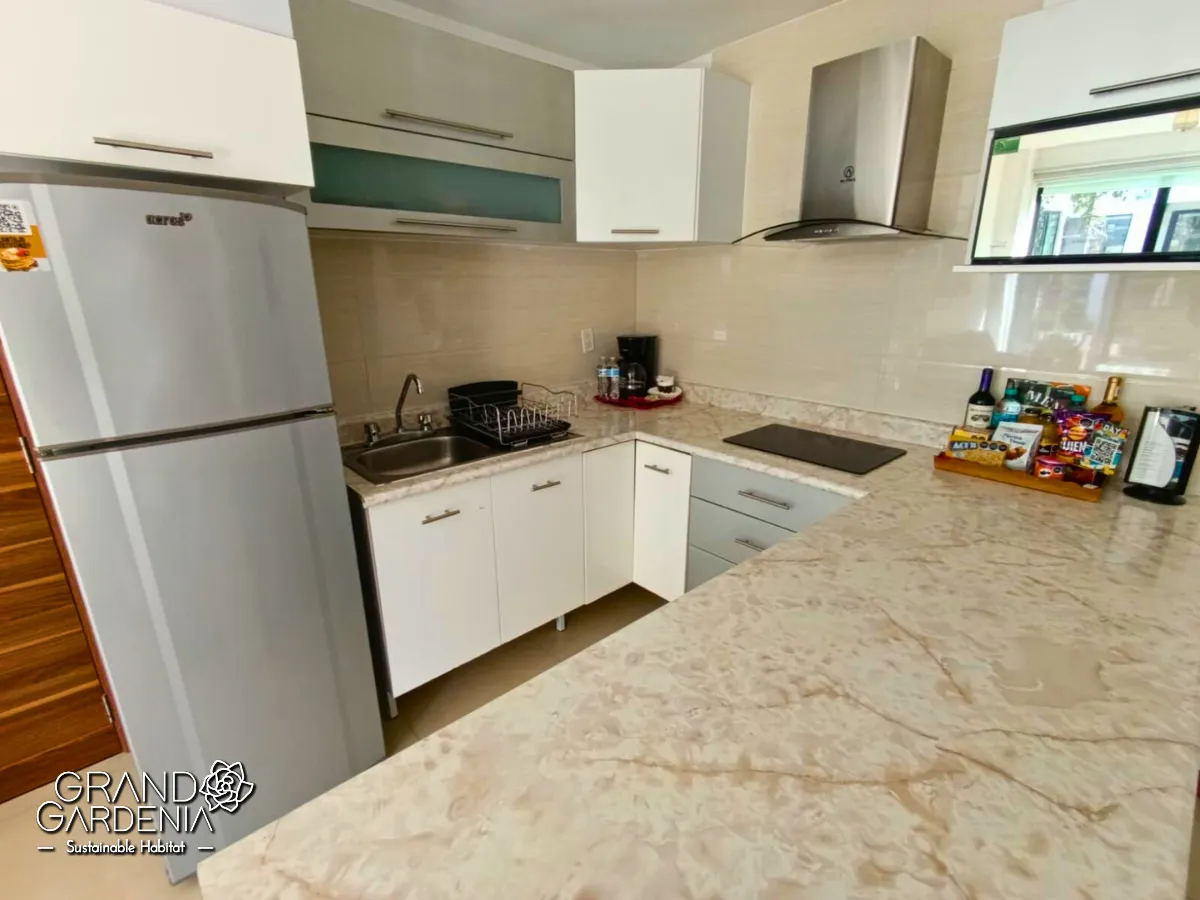 La cocina está completamente equipada con nevera, utensilios de cocina, horno y microondas.